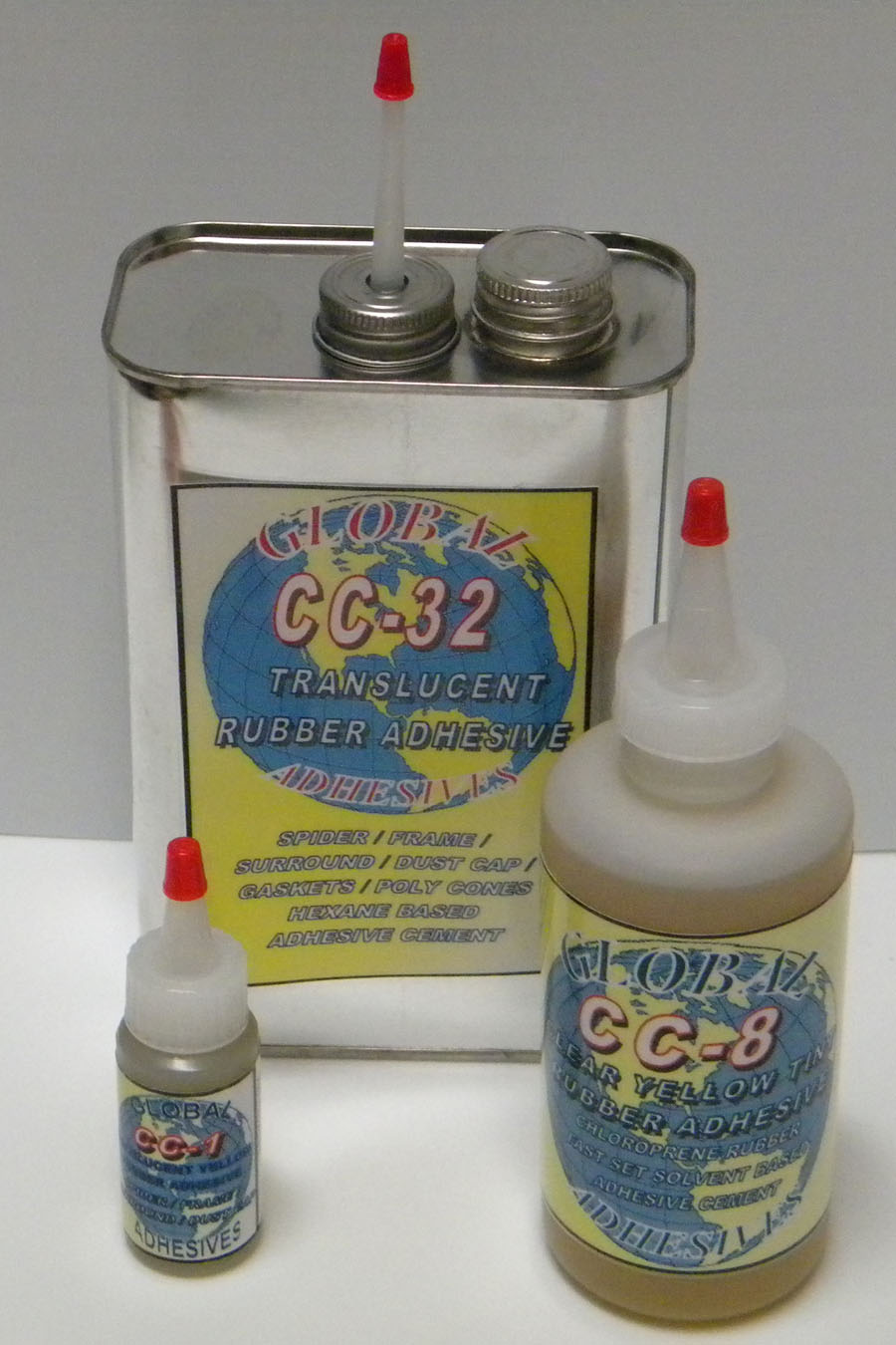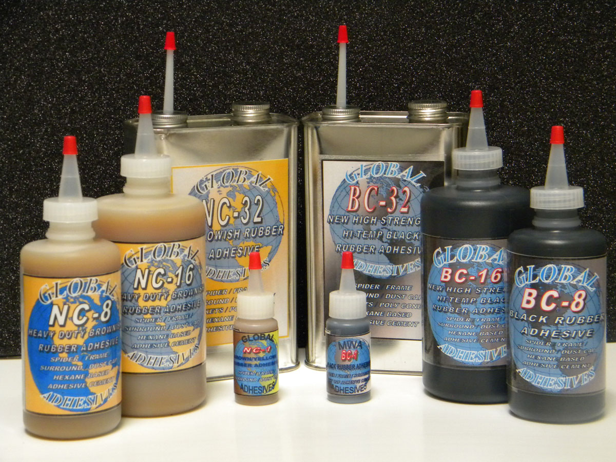 BLACK & YELLOW HEAVY DUTY ADHESIVES These heavy duty rubber cements have been re-formulated to bond even stronger on cloth and foam surrounds to the frame and cone. They are also excellent for bonding gasket and spider to frame. These are both fast curing material designed to work on steel, aluminum, paper, cloth, foam, felt, paperboard and plastic. They have excellent heat and water resistance. |