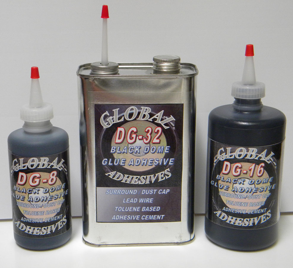 | BLACK DOME GLUE This solvent based black rubber cement is very thixotropic and flexible. This cement has excellent adhesion to difficult to bond to surfaces such as polypropylene, styrene, butyl rubber and most of the coated cloth cones. It was designed for bonding dust caps to the cones and coating lead wires. |